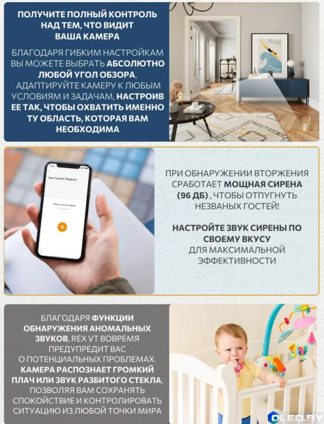 Тревожные уведомления: Детектирование движения, домашнего животного, человека, аномальных звуков.