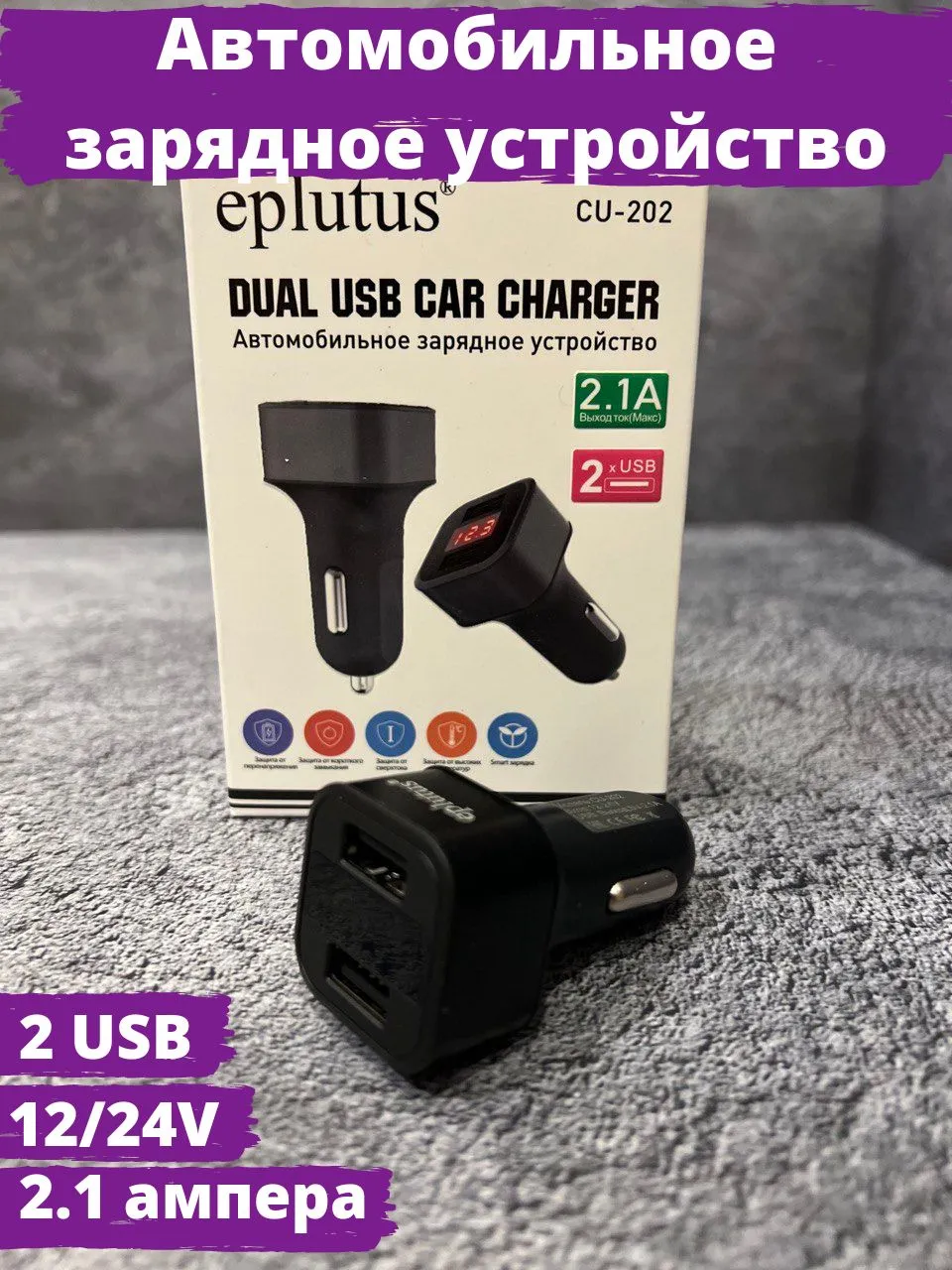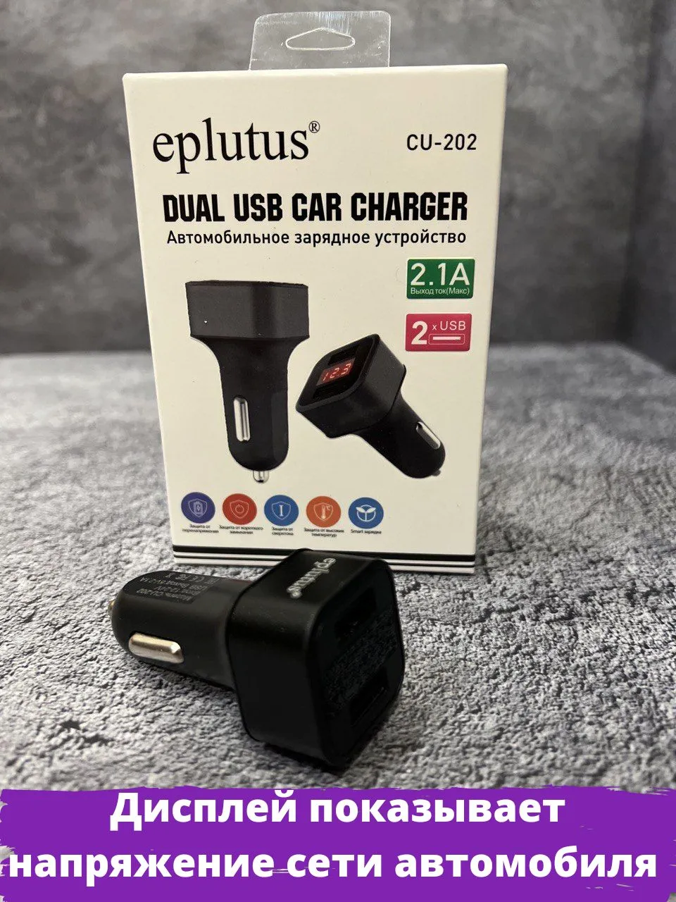 Автомобильное зарядное устройство Eplutus CU-202 оснащен LED дисплеем 2 разъемами USB Отображает: напряжение бортовой сети автомобиля напряжение на USB силу тока (А) в реальном времени.