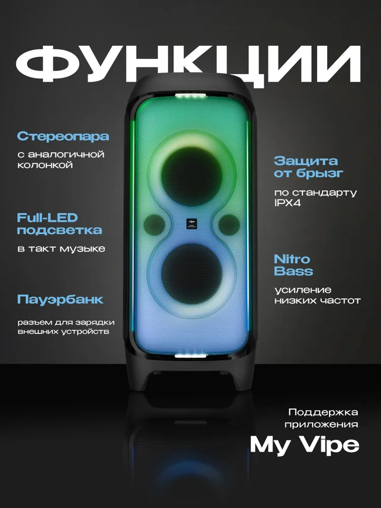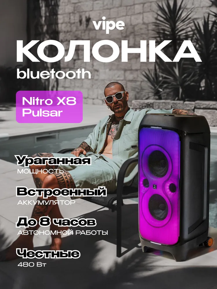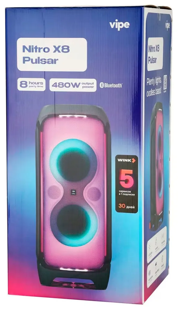 Саундбокс Vipe Nitro X8 Pulsar оснащен яркой и динамичной Full LED-подсветкой всей лицевой панели, вертикальными LED полосками, стробоскопами в нижней и верхней частях колонки, а также цветной подсветкой в нижней части колонки. Предустановленные режимы и выбор цвета позволят подобрать освещение в такт к музыке или к подходящей обстановке. Всё это расширяет музыкальный опыт ярким световым шоу от Vipe!