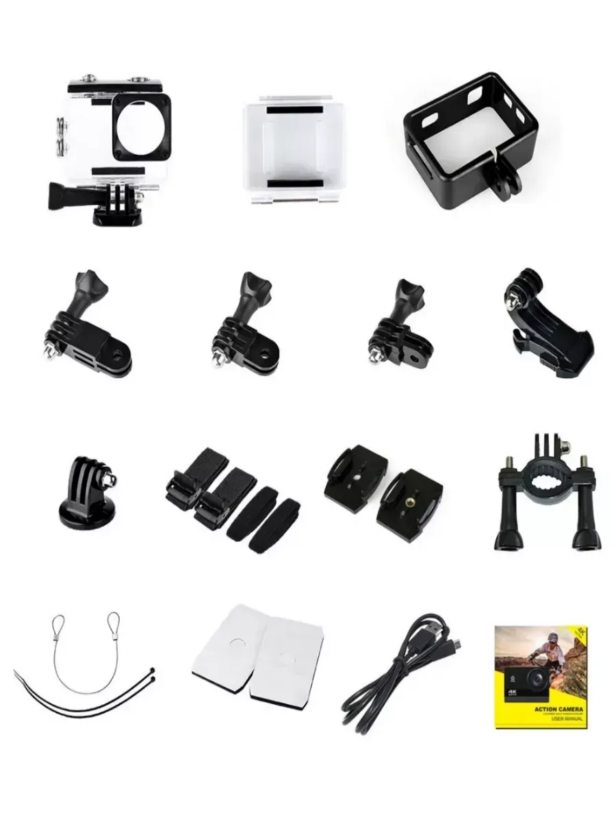 Набор экшн-креплений в ассортименте: на голову, на шлем, на грудь, на плоские поверхности, на руль, водозащитный бокс