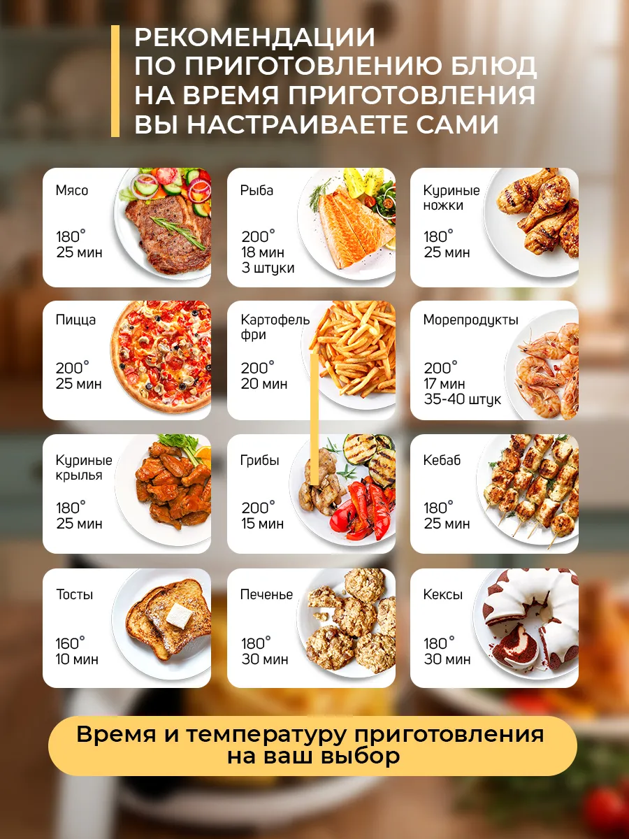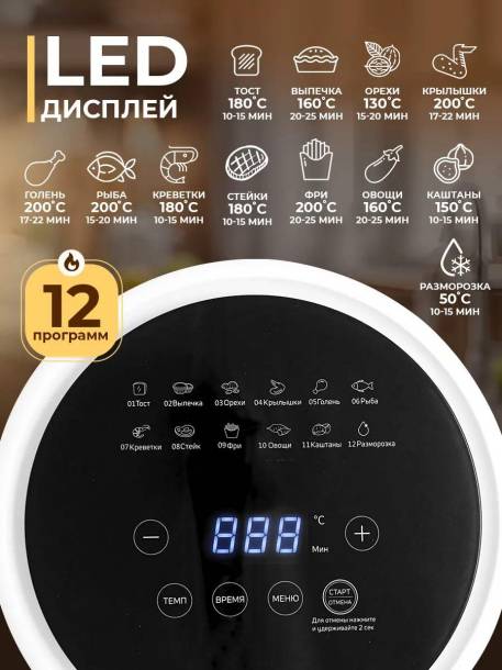Благодаря компактным размерам аэро гриль легко поместится даже на небольшом кухонном столе. Стильный белый дизайн впишется в любой интерьер, а простота в управлении сделает его доступным для любого пользователя.