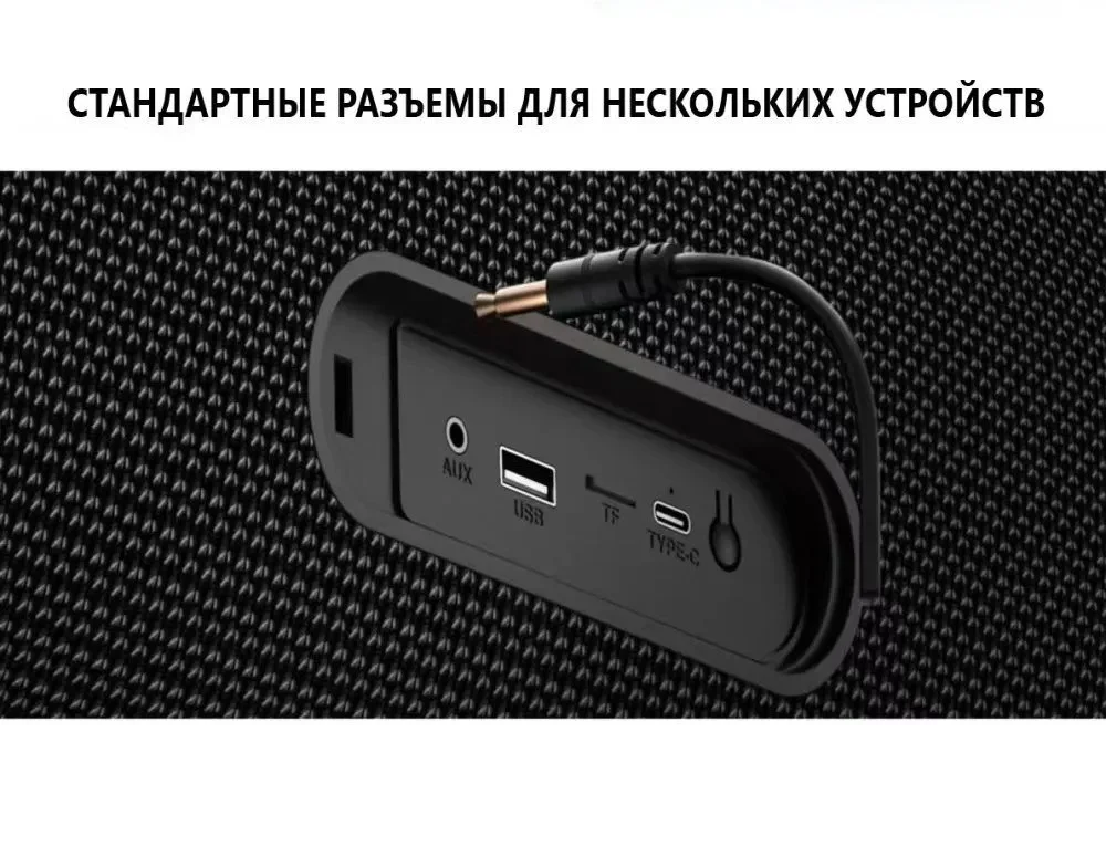 В задней части акустика имеет скрытые герметичной заглушкой разъемы USB, microUSB, TF, AUX. Сверху бумбокса расположены прочные петли под ремень для ношения через плечо.