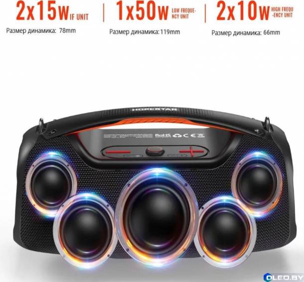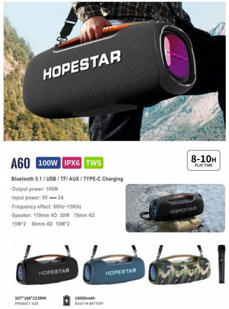 НОВИНКА 2025! Колонка A60 - первая колонка Hopestar с 5 динамиками - на 100W! Колонка Hopestar A60 - это стильная и мощная новинка от бренда качественных Bluetooth колонок с великолепным, насыщенным звучанием. Модель Hopestar A60 выполнена из прочного пластика с Soft Touch покрытием, а лицевая часть и динамики надежно защищены синтетической тканью, а кнопки управления прорезинены и нажимаются с отчетливым кликом.
