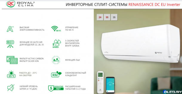 Кондиционер Royal Clima RCI-RND30HN (серия Renaissance DC EU Inverter, 2024) — это инверторная сплит-система для помещений до 30 м2, отличающаяся высокой энергоэффективностью (класс А), низким уровнем шума (от 19 дБ) и качественным компрессором TOSHIBA GMCC.