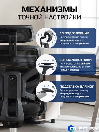 Кресло оснащено подголовником и регулируемыми подлокотниками, что делает его еще более удобным. Вы сможете настроить высоту подлокотников и подголовника, чтобы обеспечить максимальную поддержку и снизить нагрузку на шею и плечи.