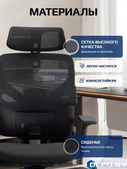 Материалы: Спинка выполнена из прочной дышащей сетки, сиденье — из ткани с наполнением из высокоплотной пены, что обеспечивает комфорт.
