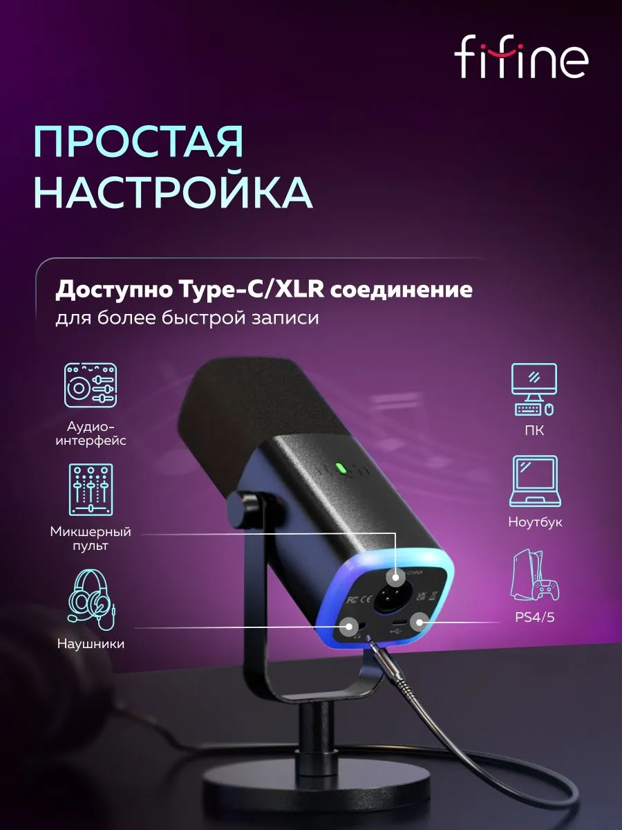 Для подключения микрофона в комплекте есть съемный кабель USB Type-A - USB Type-C. Также можно подсоединить его через XLR и кабель jack 3.5 мм.