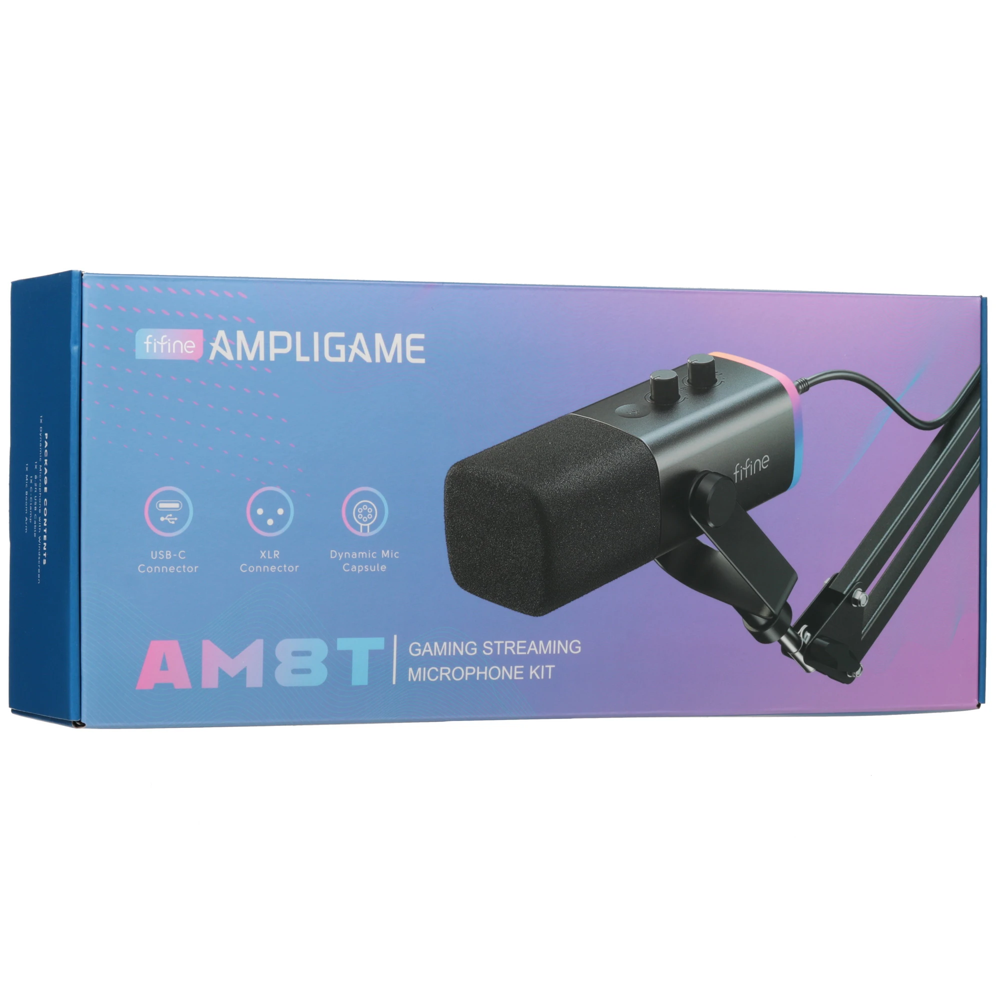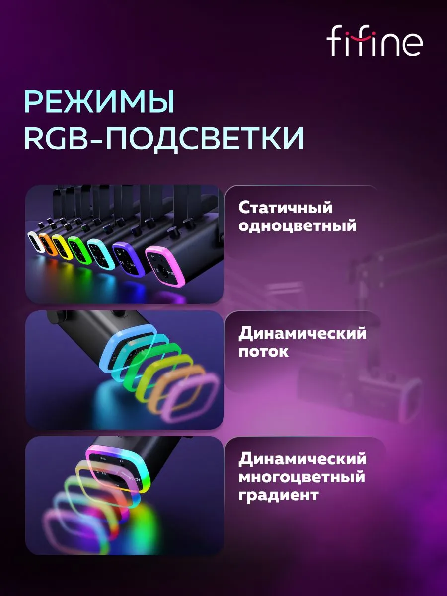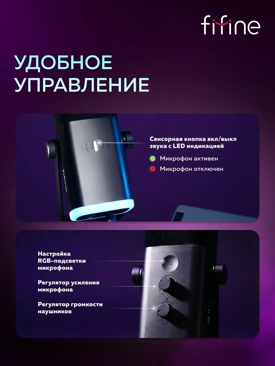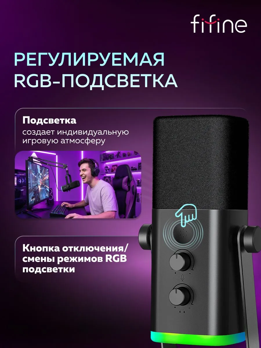 Микрофон из комплекта Fifine AM8T подходит для работы в студии или записи с помощью компьютера. Его чувствительность при кардиоидном направлении звука улавливает частоты в диапазоне от 50 до 16000 Гц. Громкость при подключении к наушникам, а также чувствительность можно регулировать. На корпусе есть сенсорная кнопка для отключения устройства, а также RGB-подсветка.
