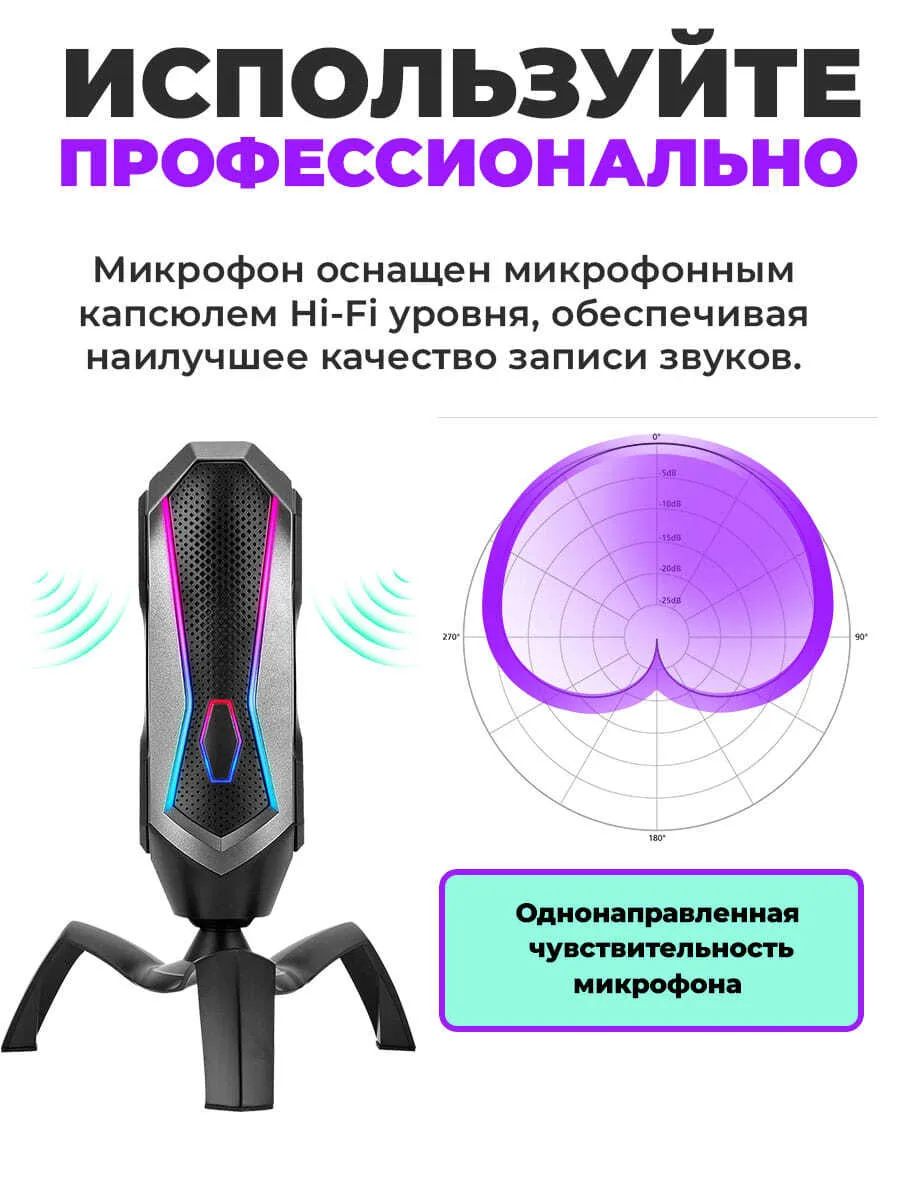 Тип микрофона: Конденсаторный, кардиоидный. Кардиоида обеспечивает фокус на голосе, снижая улавливание звуков сбоку и сзади (эффект близости).