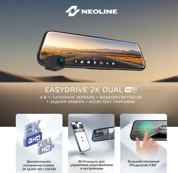 Neoline EasyDrive 2K Wi-Fi Dual - это двухканальный автомобильный видеорегистратор зеркало: с двумя камерами: заднего и переднего вида. Тот авто регистратор, который нужен всем!