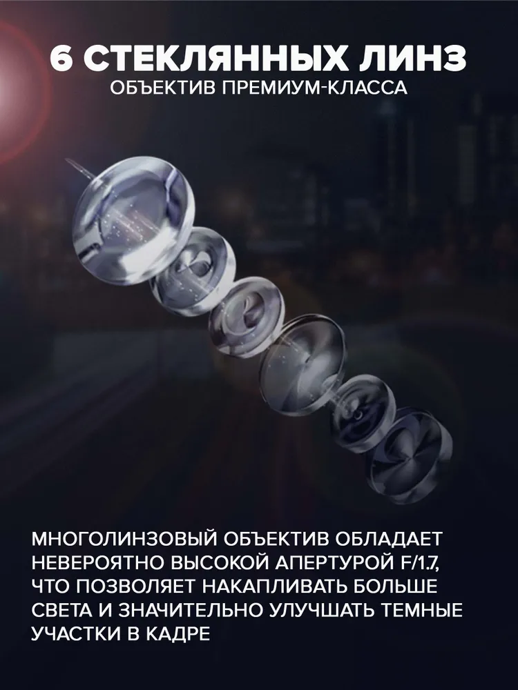 Многолинзовый объектив обладает невероятно высокой апертурой F/1.7, что позволяет накапливать больше света и значительно улучшать темные участки в кадре. Это особенно важно при движении в темное время суток или в условиях плохой видимости.