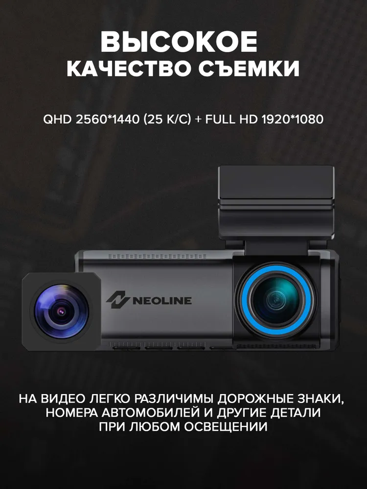 Передовое качество изображения благодаря высокому разрешению. Фронтальная камера снимает в 2К QUAD HD (2560 х 1440), задняя - в Full HD (1920 х 1080). Видеорегистратор Neoline FLASH 2K Dual с камерой заднего вида идеален для тех, кто хочет получить максимальную четкость каждого кадра.
