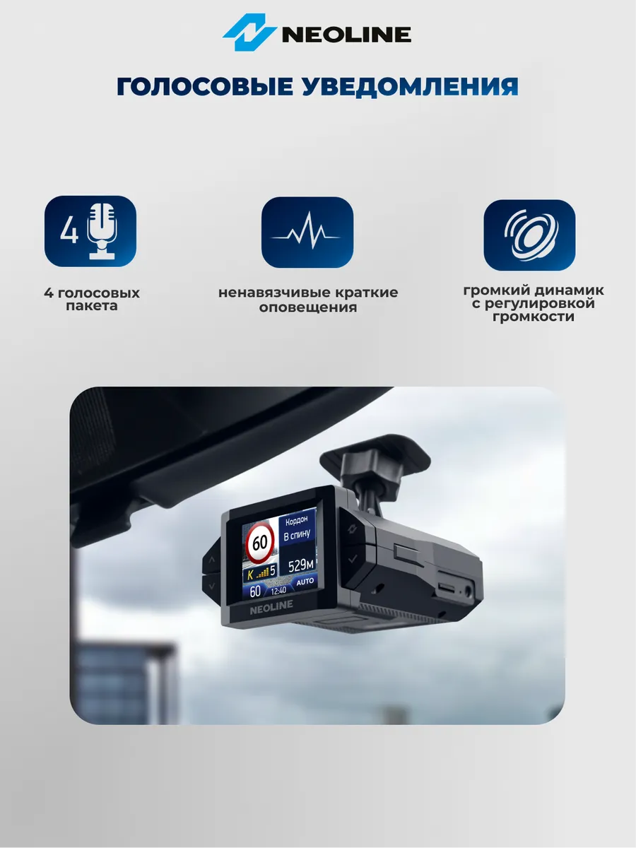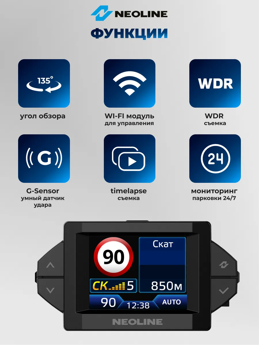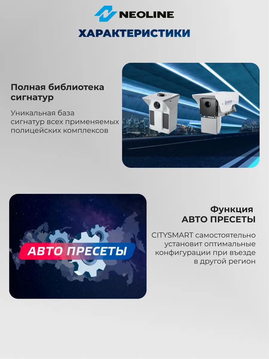 Видеорегистратор с сигнатурным радар-детектором Neoline X-COP CITYSMART обеспечивает уверенное детектирование полицейских радаров. Распознает стационарные и мобильные комплексы, включая работающие «в спину».