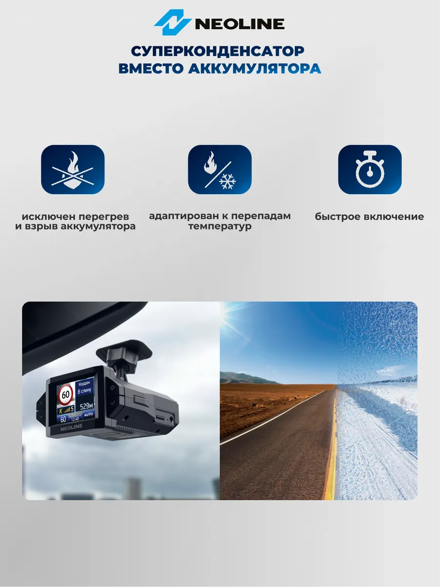 В Neoline X-COP CITYSMART встроен сверхнадежный суперконденсатор, который обеспечивает быстрое включение и стабильную работу гибрида при перепадах температур. Отсутствует риск перегрева, взрыва батареи или потери последних записанных файлов.