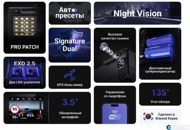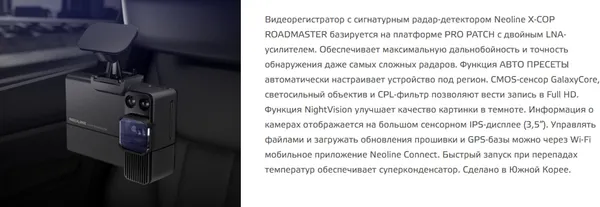 Видеорегистратор с сигнатурным радар-детектором Neoline X-COP ROADMASTER базируется на платформе PRO PATCH с двойным LNA-усилителем.