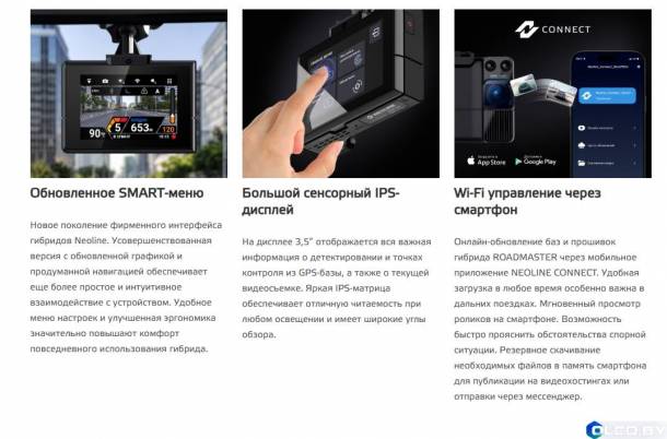 Онлайн-обновление баз и прошивок гибрида ROADMASTER через мобильное приложение NEOLINE CONNECT. Удобная загрузка в любое время особенно важна в дальних поездках. Мгновенный просмотр роликов на смартфоне. Возможность быстро прояснить обстоятельства спорной ситуации. Резервное скачивание необходимых файлов в память смартфона для публикации на видеохостингах или отправки через мессенджер.