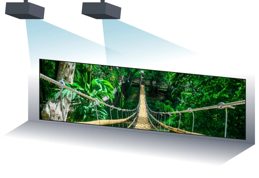 Встроенный процессор сшивки и коррекции геометрии изображения позволяет создавать единую картинку с нескольких проекторов без необходимости использования дополнительного оборудования, уменьшая тем самым стоимоcть и сложность установки, и повышая гибкость решения. Блендинг краев изображения настраивается либо на экране проектора, либо с помощью специального программного обеспечения на ПК в зависимости от модели.