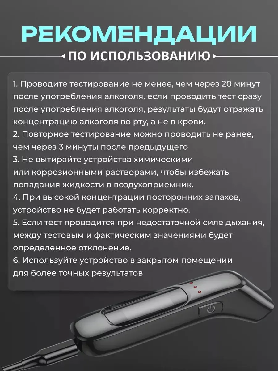Перед использованием прополощите рот чистой водой. Воздержитесь от курения или питья напитков не менее чем за 15 минут до проведения теста. Если вы выполняете тест сразу после выпитого напитка, показания будет колебаться от высоких значений до низких. Это связано с остатками ароматического напитка во рту, которые влияют на результаты теста. Это так же произойдет с остатками табака, алкогольными ополаскивателями для рта или спреями для ротовой полости, лекарствами или наркотиками, а так же с отрыжкой и рвотой. Когда алкоголь попадает в кровь через желудочно-кишечный тракт (рот, желудок кишечник), он распространяется по всем частям тела, включая легкие. Этот период будет длиться от 15-30 минут до стабилизации показаний. Наше устройство анализирует выдыхаемый воздух человеком и дает цифровые данные приблизительной концентрации алкоголя в крови человека (известной как ВАС). Если пользователь направит в датчик очень высокую концентрацию этанола, данные будут неточными, необходимо ждать 10 минут для испарения из датчика.