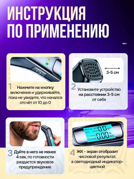 Цветовая и звуковая индикация: Результаты сопровождаются звуковым сигналом и визуально дублируются на дисплее (зеленый/желтый/красный свет в зависимости от степени опьянения).