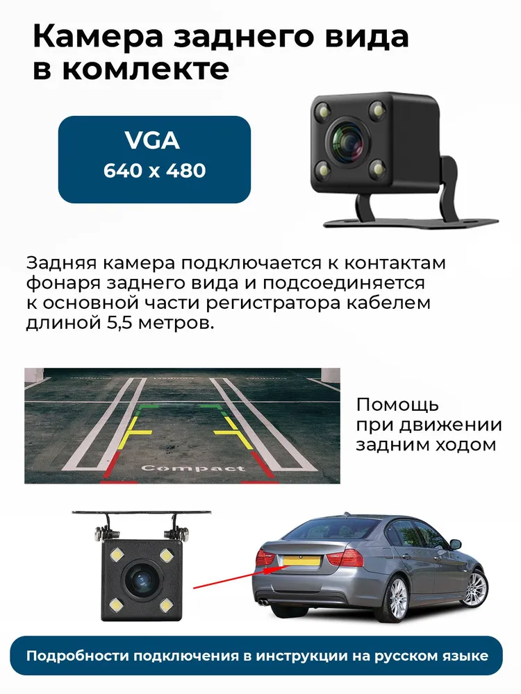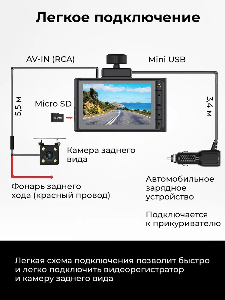 В комплект входит кабель mini USB для подключения к питанию от прикуривателя автомобиля. Также в устройство встроен литиевый аккумулятор на 200 мАч – в случае внезапного отключения питания вследствие аварии, этого заряда хватит для корректной записи и сохранения на карту короткого ролика самого важного момента самого столкновения. Устройство питается от 5В DC. Убедительно просим вас использовать исключительно заводской адаптер: прочие адаптеры могут подать на видеорегистратор повышенное напряжение 12В, соответствующее напряжению на прикуривателе, что приведёт к повреждению устройства.