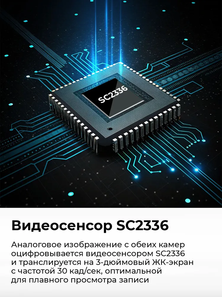 Возможности камеры видеорегистратора AVR-5302 расширены как за счёт продвинутого объектива, так и технической оснащённости устройства. Линза может охватывать пространство на 140°, а за счёт 4-слойного просветления и технологии WDR картинка получается более насыщенной. Starlight vision (режим особого ночного видения) обеспечит стабильную запись в ночное время, а разрешение Full HD (1920*1080p) позволит получить файлы видеозаписи в высоком качестве. Аналоговое изображение с обеих камер оцифровывается видеосенсором SC2336 и транслируется на 3-дюймовый ЖК-экран с частотой 30 кад/сек, оптимальной для плавного просмотра записи.
