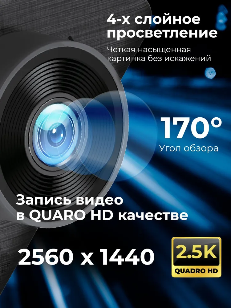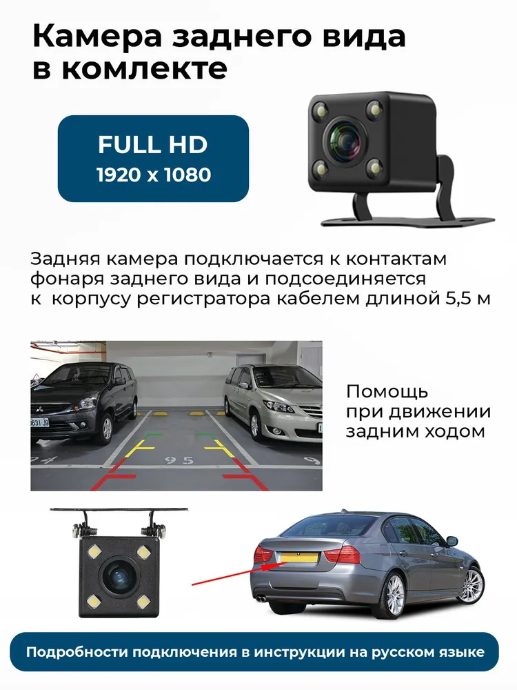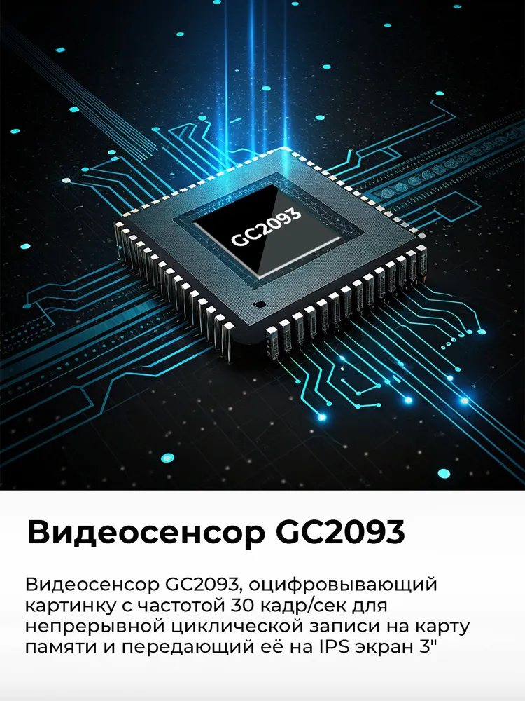 Основная (передняя) камера встроена в корпус видеорегистратора, записывает фото и видео в формате Quadro HD 2.5K (2560х1440 пикселей). В комплекте с основным устройством прилагается камера заднего вида с разрешением Full HD (1920х1080 пикселей). При этом угол обзора обеих камер расширен до 170° по диагонали, благодаря чему вы получаете практически полный захват окружающего автомобиль пространства. Аналоговое изображение с обеих камер оцифровывается видеосенсором GS2093 и транслируется на 3-дюймовый ЖК-экран. Переключить трансляцию несложно с помощью кнопки "Вниз".