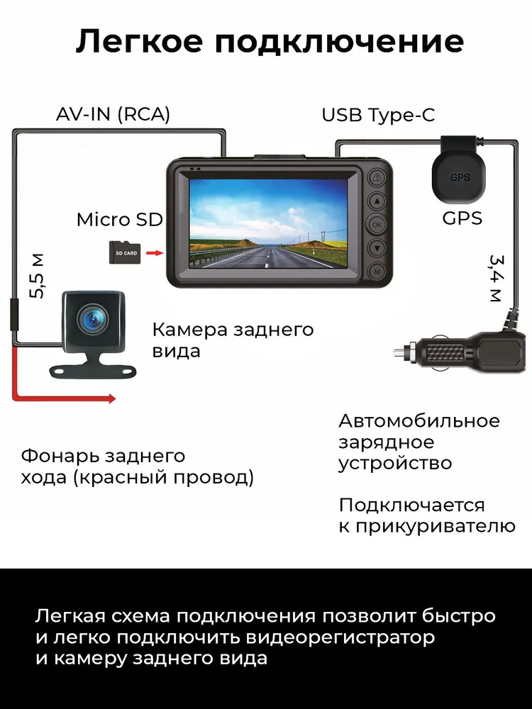 В комплект поставки входит кабель питания USB Type-C с адаптером к прикуривателю автомобиля. Также стоит отметить, что в устройство встроен конденсатор Super Capacitor 2.0 UF – в случае отключения от сети вследствие дорожного происшествия, этого заряда хватит для корректного сохранения на карту памяти перед отключением видеорегистратора самого важного видеоролика - момента столкновения. Устройство питается от 5В DC через порт Type-C. Убедительно просим Вас использовать исключительно заводской адаптер: прочие адаптеры могут подать на устройство напряжение 12В, соответствующее напряжению на прикуривателе, что приведёт к неисправности устройства.