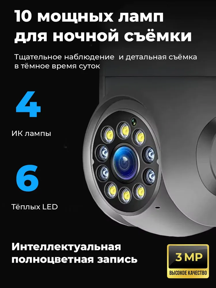 две внешние антенны для лучшего улавливания сигнала Wi-Fi; 4 ИК и 6 LED ламп, позволяющих камере делать насыщенную цветную запись ночью;