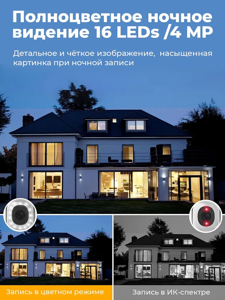 Оснащение в виде ИК-прожекторов и светодиодного кольца вокруг объектива позволяет получать полноцветную запись в любое время суток или переключить устройство в режим ночного видения.
