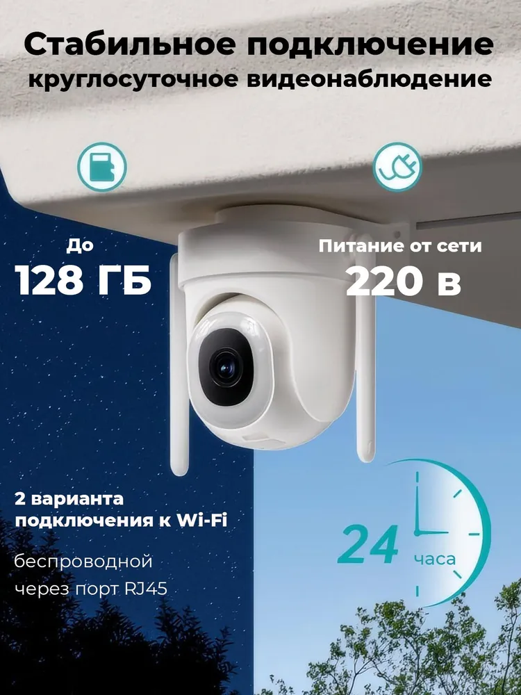 Улавливание сигнала Wi-Fi осуществляется 2 внешними антеннами, за счёт чего вы можете разместить устройство на большем расстоянии от маршрутизатора, чем обычные камеры только со встроенным модулем Wi-Fi. Также вы можете подсоединить устройство к вашей локальной сети через Ethernet-кабель