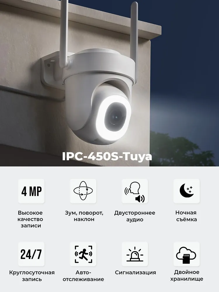 Многофункциональная камера IPC-450S-Tuya подходит для применения как на улице, так и дома.
