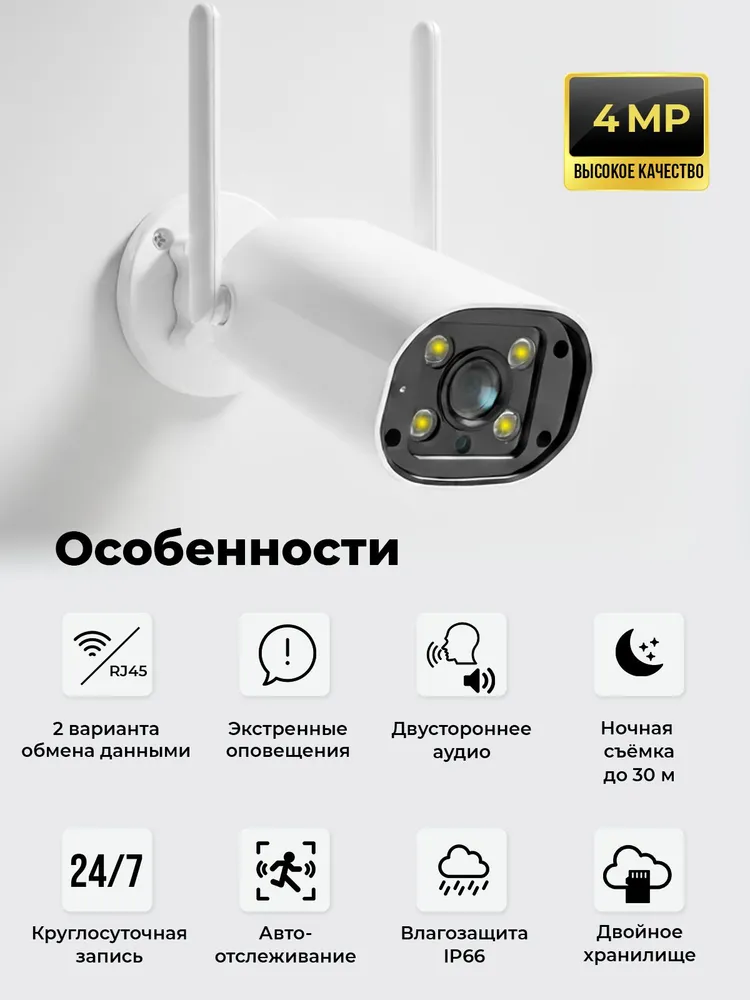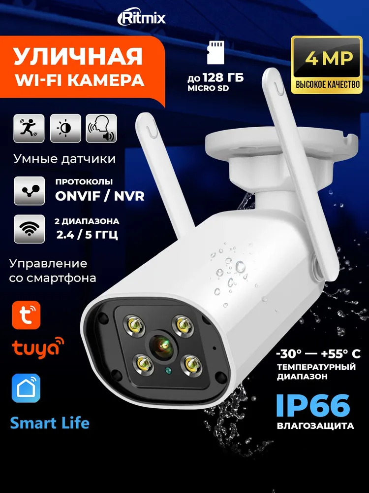 RITMIX IPC-460S-Tuya — это уличная Wi-Fi IP-камера видеонаблюдения с разрешением 4MP (2560x1440) на базе IPS-матрицы, оснащенная датчиками движения и звука, поддержкой двусторонней связи (микрофон/динамик), слотом для карт microSD до 128 ГБ, записью 24/7 и интеграцией с экосистемой Tuya, обеспечивающая качественный мониторинг и управление через смартфон.