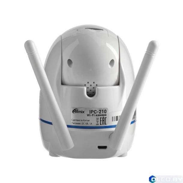Камера наблюдения Ritmix IPC-210 имеет поворотные антенны, для уверенного приёма Wi-Fi сигнала от Вашего Wi-Fi роутера, а также разъём RJ45 для альтернативного сетевого подключения к интернету. Камера надёжно располагается на любой горизонтальной плоскости, имеет на нижней части корпуса резьбу под стандартный штатив, а идущий в комплекте набор крепления позволит прочно закрепить камеру и на стене или потолке. Функция «переворот картинки» ведёт при этом видеозапись в привычном неперевернутом виде.