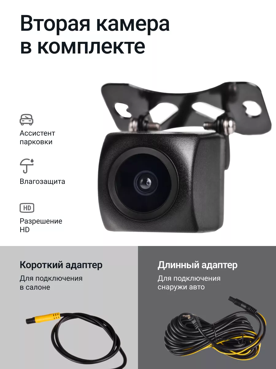 Комплектация Камера заднего вида Крепление на присоске Адаптер питания 2 крепления на скотче и саморезы для второй камеры Карт-ридер Документация