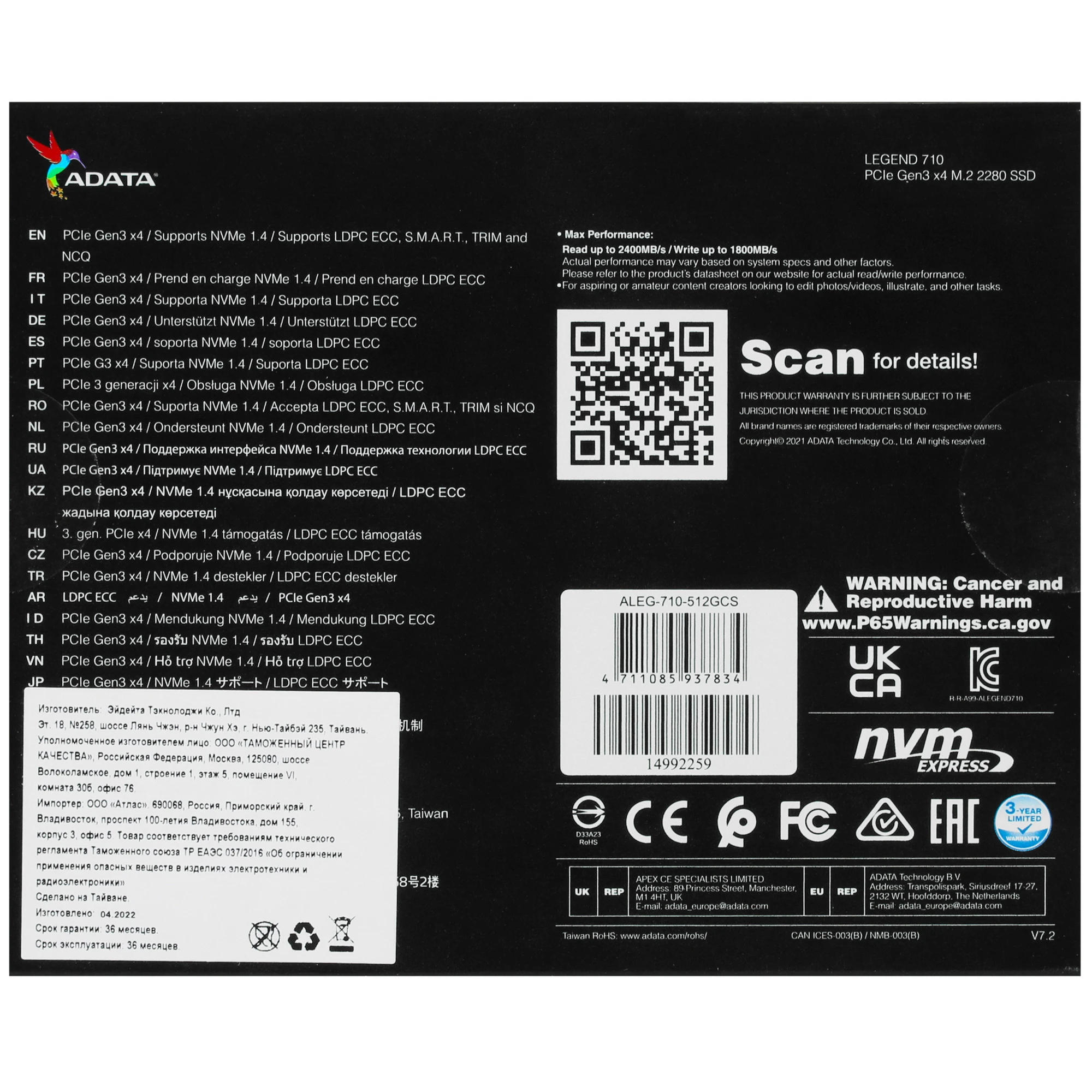 ADATA Legend 710 512GB (ALEG-710-512GCS) — это бюджетный M.2 NVMe SSD с интерфейсом PCIe Gen3 x4 и скоростями до 2400/1800 МБ/с (чтение/запись), использующий 3D TLC NAND память и контроллер Realtek.