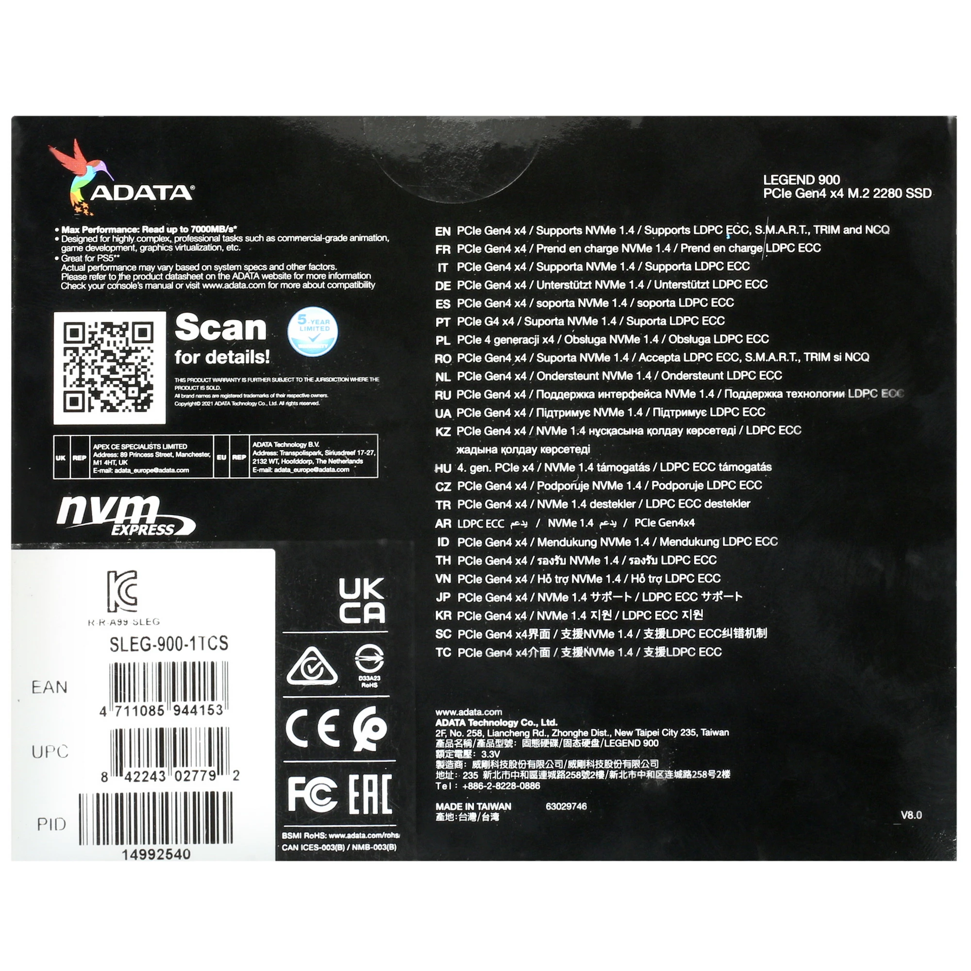 ADATA Legend 900 1Tb (SLEG-900-1TCS) — это быстрый NVMe SSD с интерфейсом PCIe 4.0 x4 в форм-факторе M.2 2280, предлагающий скорости до 7000 МБ/с чтения и 4700 МБ/с записи, что значительно ускоряет игры, работу с графикой и приложения, с ресурсом до 600 TBW и поддержкой 3D NAND TLC памяти, идеально подходит для апгрейда ПК, ноутбуков и даже PS5, обеспечивая надежность и высокую производительность.