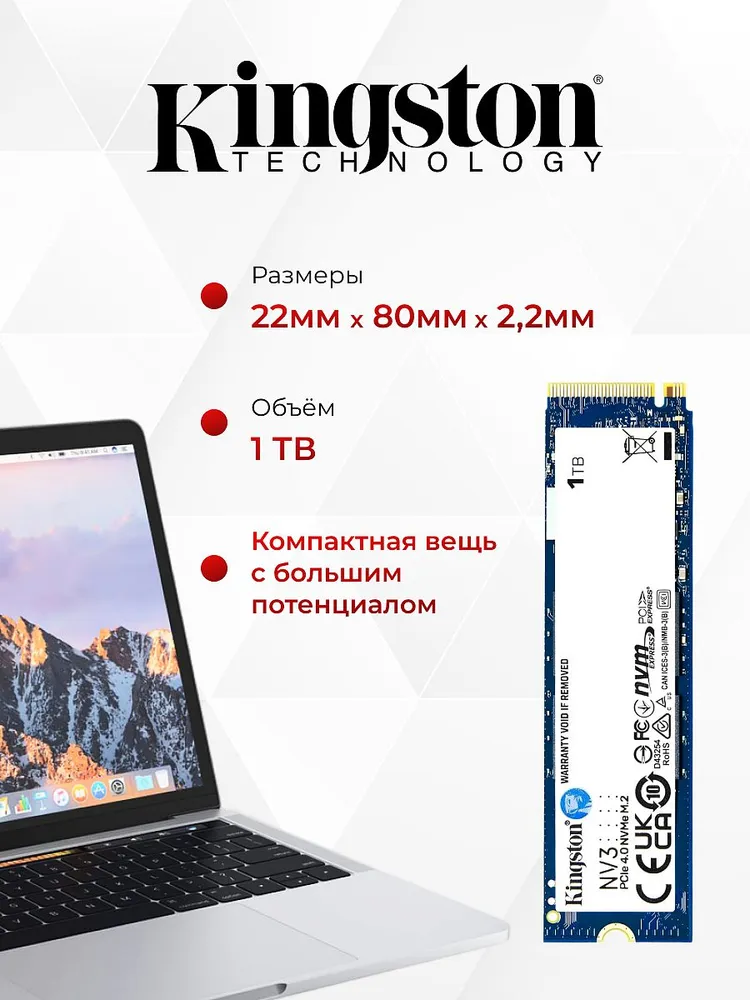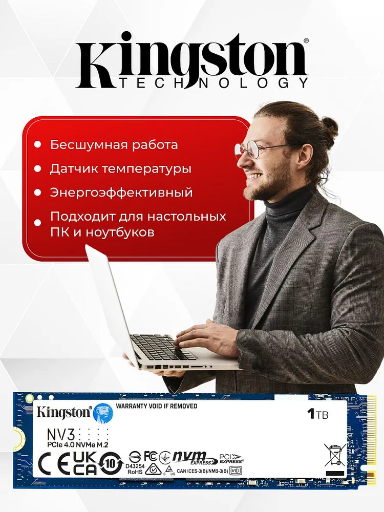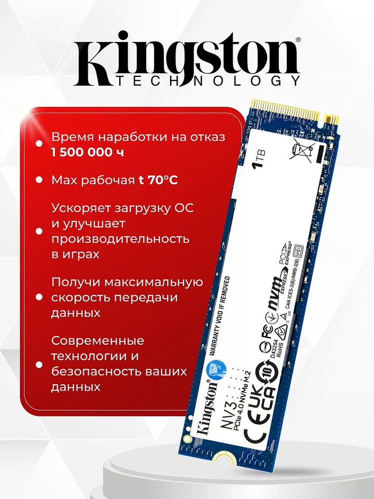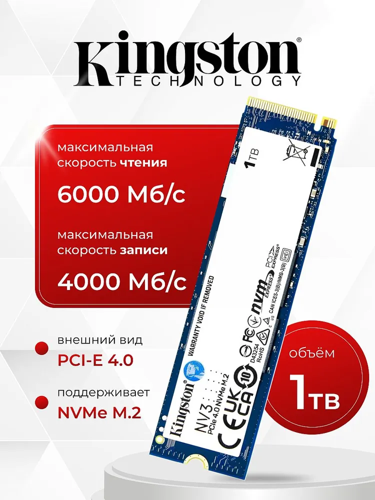 SSD Kingston NV3 1TB (SNV3S/1000G) — это бюджетный NVMe накопитель 4-го поколения, отличающийся высокой скоростью чтения (6000 МБ/с) и записью (4000 МБ/с) для повседневных задач, игр и хранения данных.