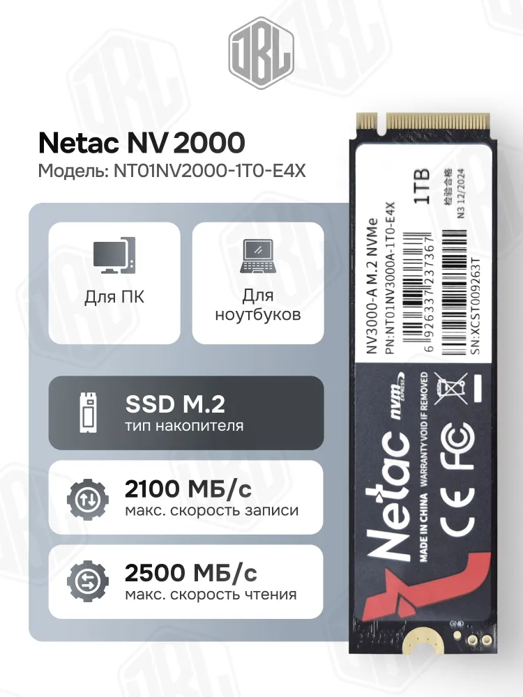 SSD Netac NV2000 1TB — это бюджетный NVMe M.2 SSD с интерфейсом PCIe 3.0 x4, использующий память 3D TLC NAND, предлагающий скорости чтения до 2500 МБ/с и записи до 2100 МБ/с, подходящий для общего пользования и игр, поддерживающий HMB и SLC-кэширование, но без аппаратного шифрования.
