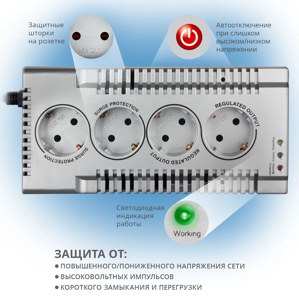 Сам стабилизатор готов к любым испытаниям благодаря тепловой защите трансформатора, высокой способности к перегрузке, а также ряду проверенных и эффективных инженерных решений.
