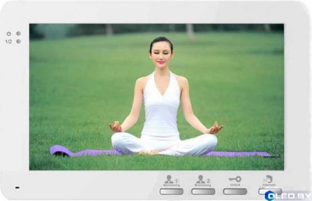 Цветной монитор 7”, разрешение 1280х960; подключение: 2 вызывные панели, 1 дополнительный монитор, до 4 аудиомониторов в интерком; поддержка CVBS и AHD форматов видео; поддерживаемые функции: мониторинг, интерком, открытие двери, запись видео/фото, SD карты до 32Гб (не входит в комплект поставки), детекция движения.