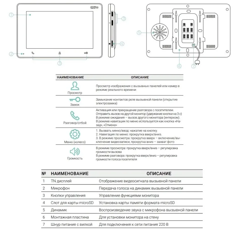 Видеодомофон (монитор) CTV-iM700 ENTRY 7 предназначен для контроля досту-па в помещение и двусторонней аудио и видео связи с посетителем при подклю-ченной ответной части – вызывной панели CTV.