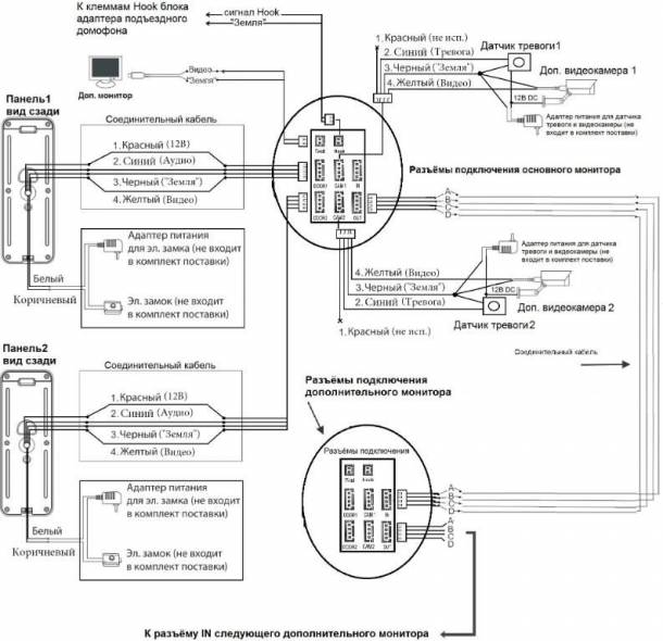 Подъездный домофон может быть подключен к монитору через блок адаптера подъездного домофона совместно с одной из вызывных панелей. Для корректной работы блока сопряжения, монитор оснащен управляющим портом HOOK, по которому передаются сигналы управления от монитора на блок сопряжения.