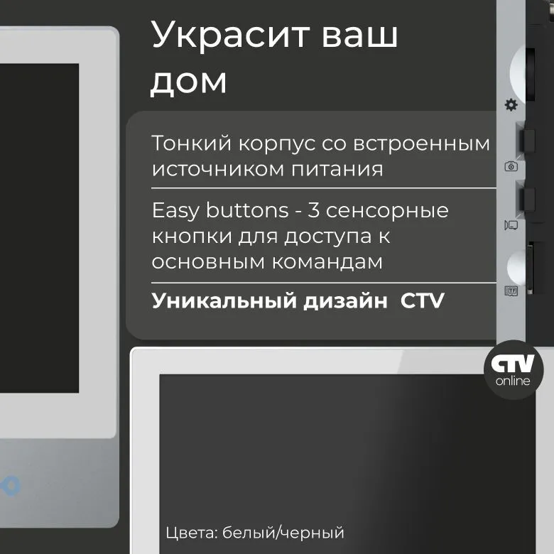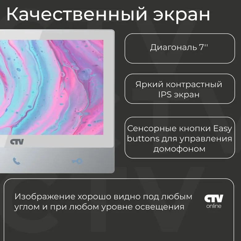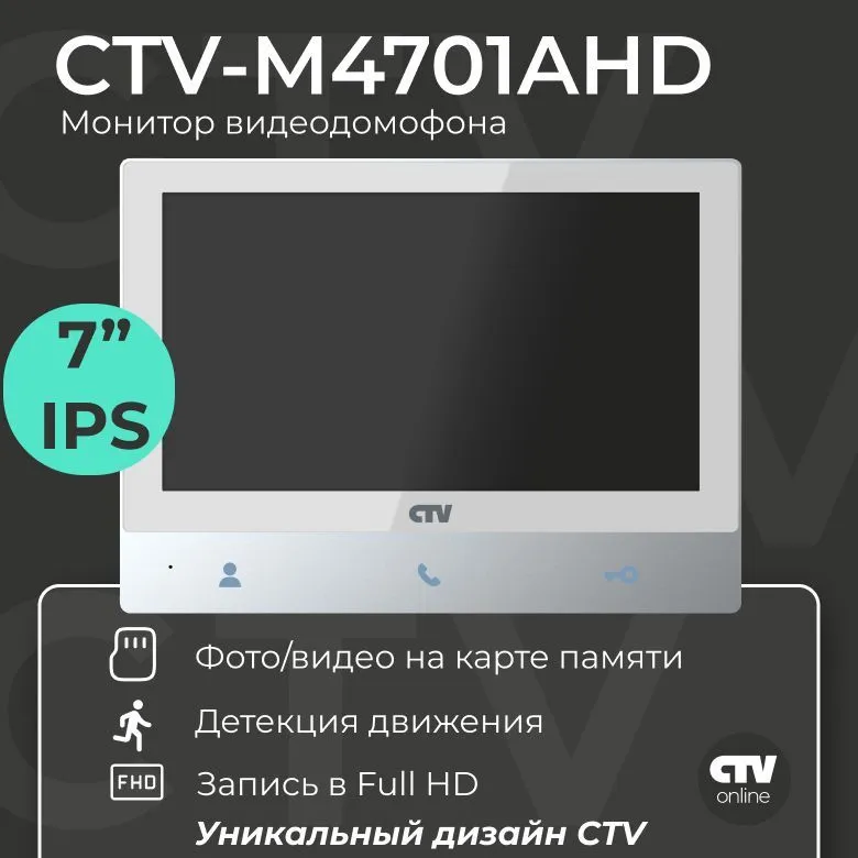 CTV-M4701AHD — это 7-дюймовый видеодомофон с качественным IPS-экраном, встроенным блоком питания и сенсорными кнопками "Easy Buttons".