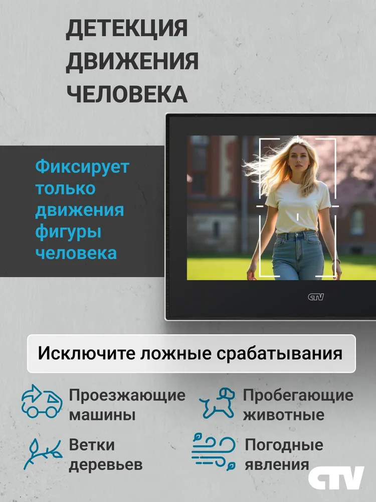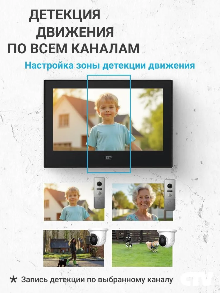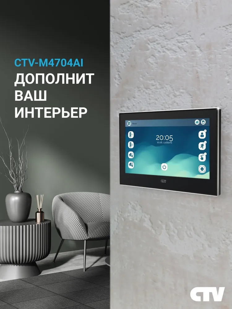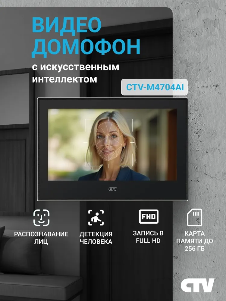 CTV-M4704AI — это 7-дюймовый IPS-монитор видеодомофона с сенсорным экраном, поддерживающий AI-функции (распознавание лиц и детекцию человека) и запись в Full HD.