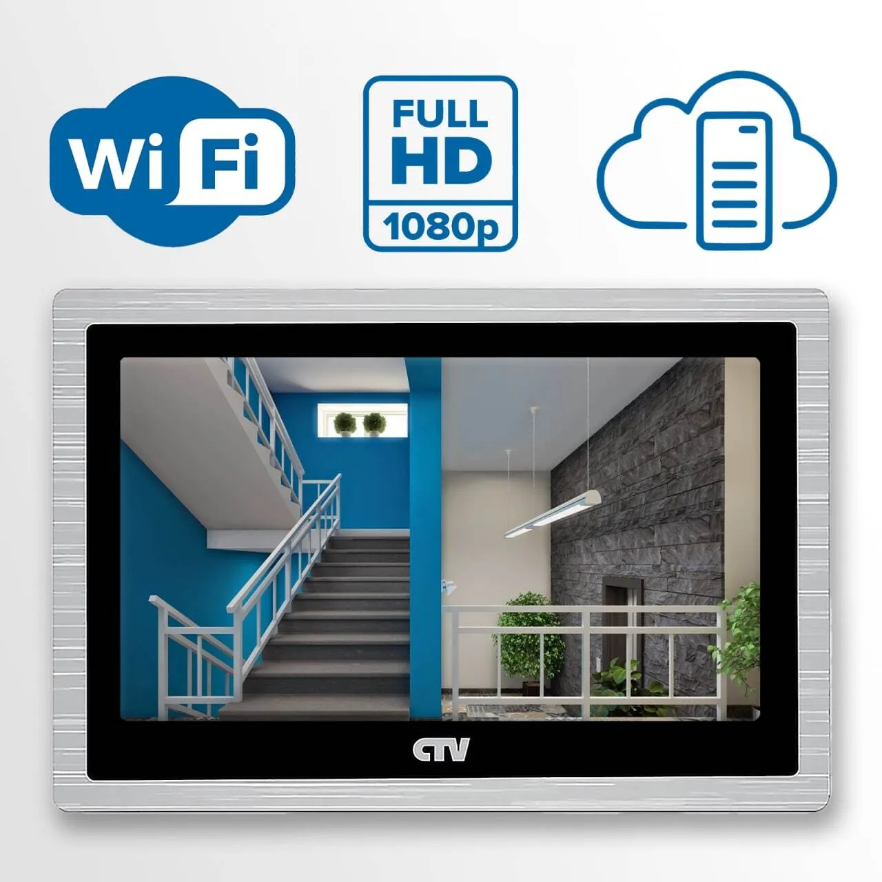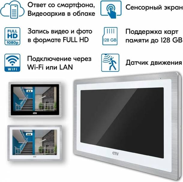 Монитор видеодомофона с 10" сенсорным дисплеем, поддержкой формата AHD и записью в Full HD. С удаленным доступом со смартфона через приложение CTV Home.