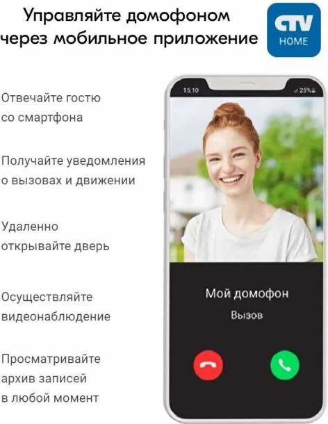 панелей и камер в режиме реального времени, получение пуш-уведомлений о движении перед камерами и вызовах посетителей, возможность удаленно отвечать на вызовы, управление подключенными к панелям замками, фотосъемка и запись видео, просмотр записей, сохраненных на карте памяти монитора, в памяти смартфона и в облаке.