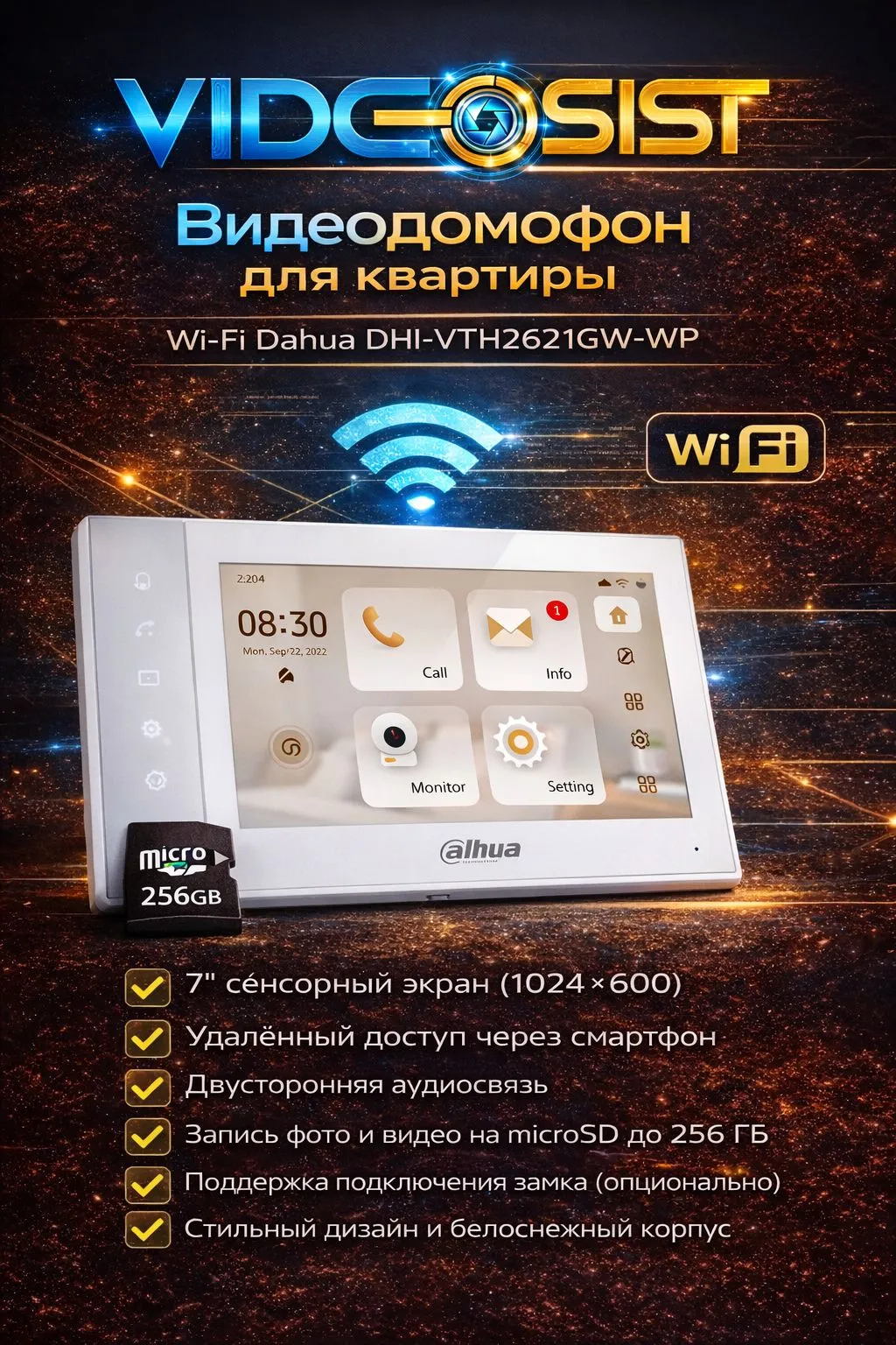 Dahua DHI-VTH2621GW-WP — это 7-дюймовый IP-видеодомофон с ёмкостным сенсорным экраном (1024x600), поддерживающий Wi-Fi (2.4 ГГц) и PoE-питание.